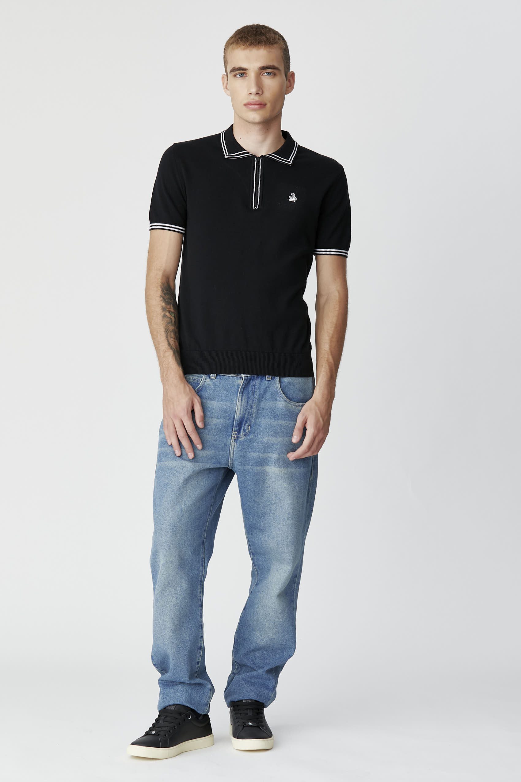Polo lisa tejida tipo sweater con acceso con cierre. Vivos contratono en cuello, puños y acceso. Parche pingüino aplicado.